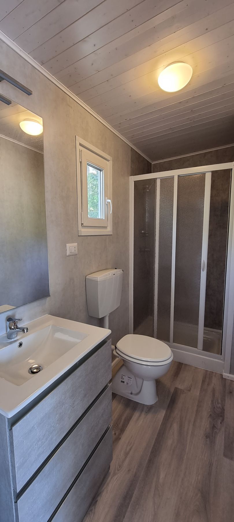 Il bagno è dotato di ampia doccia, lavabo e WC. Con lavatrice in alcova.
