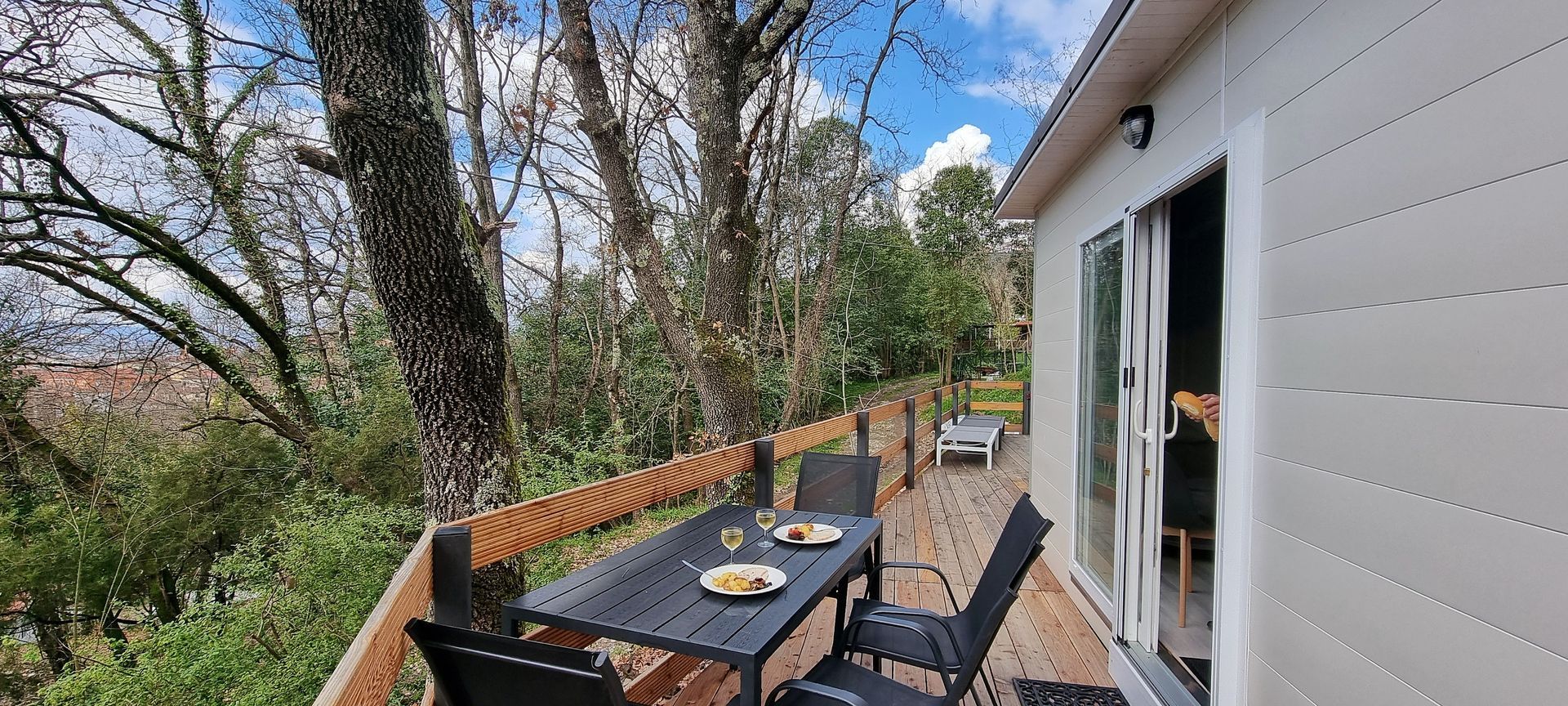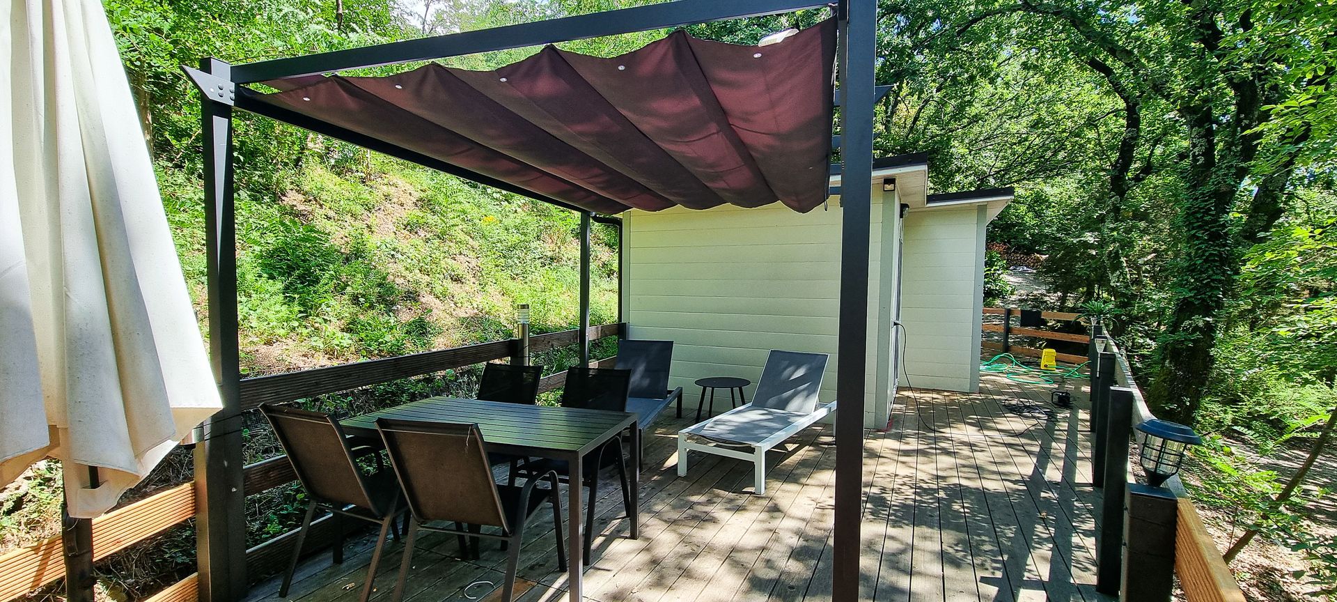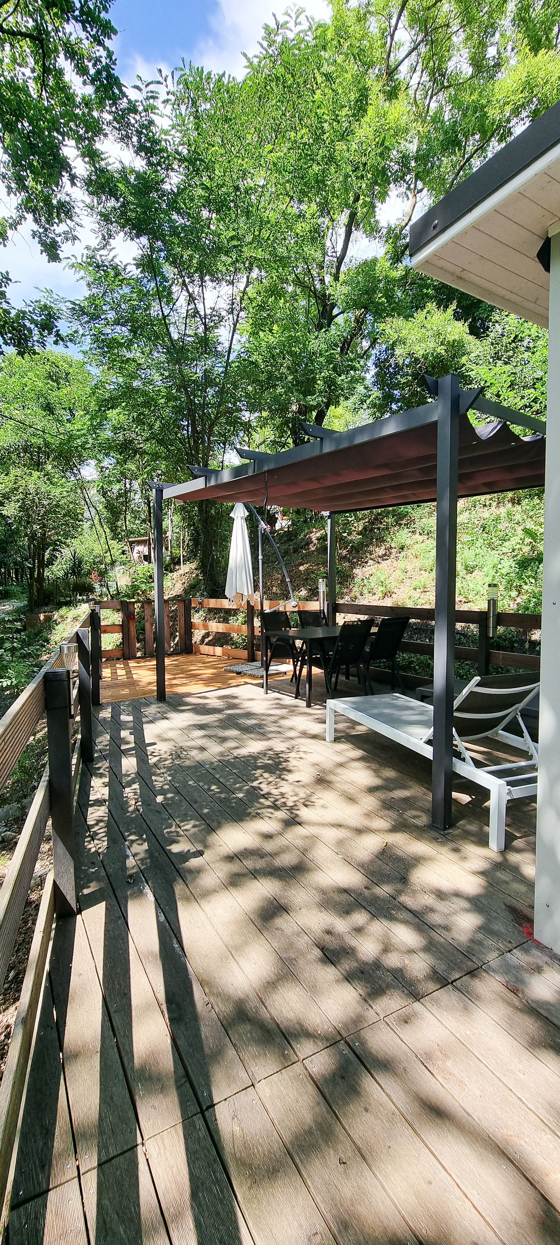 C'è un'ampia veranda che circonda l'intero chalet. Ciò include un set per una cena deliziosa e 2 lettini. Nella veranda c'è un ampio pergolato, che potrete aprire o chiudere a piacimento.